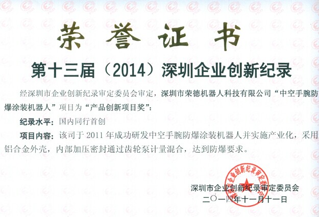 近日,由深圳市企業(yè)創(chuàng)新紀(jì)錄審定委員會(huì)為深圳市榮德機(jī)器人科技有限公司頒發(fā)了“第十三屆(2014)深圳企業(yè)創(chuàng)新紀(jì)錄”的榮譽(yù)證書,榮德公司自主研發(fā)制造的“中空手腕防爆涂裝機(jī)器人”榮獲“產(chǎn)品創(chuàng)新項(xiàng)目獎(jiǎng)”以及“深圳企業(yè)創(chuàng)新紀(jì)錄”兩項(xiàng)大獎(jiǎng),紀(jì)錄水平為“國內(nèi)同行首創(chuàng)”。