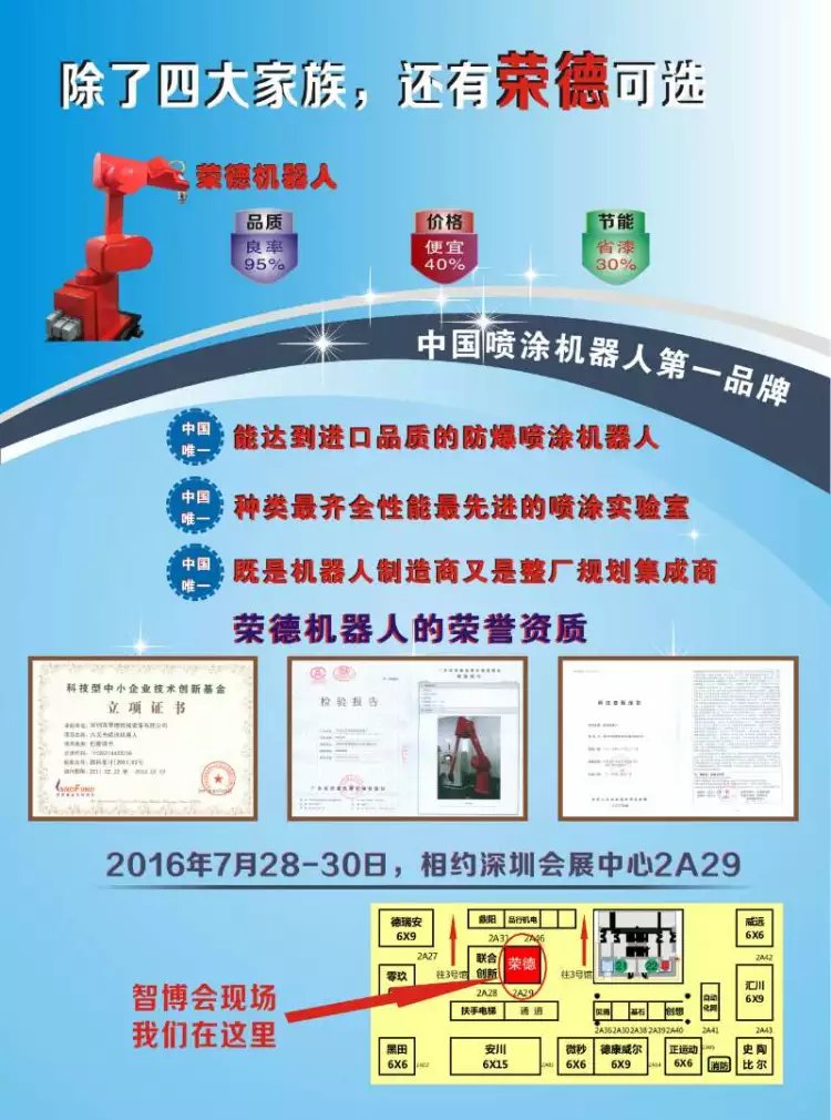 2016深圳國際智能裝備產(chǎn)業(yè)博覽會將于7月28日-30日在深圳會展中心拉開大幕,國產(chǎn)機(jī)器人唯一參展商--榮德機(jī)器人,將與國際機(jī)器人四大家族--日本安川、日本發(fā)那科、德國庫卡、瑞士ABB在二號館同臺亮相,榮德機(jī)器人在列強(qiáng)面前敢于亮劍,也熱烈歡迎新老客戶及各位朋友前往參觀指導(dǎo)。
