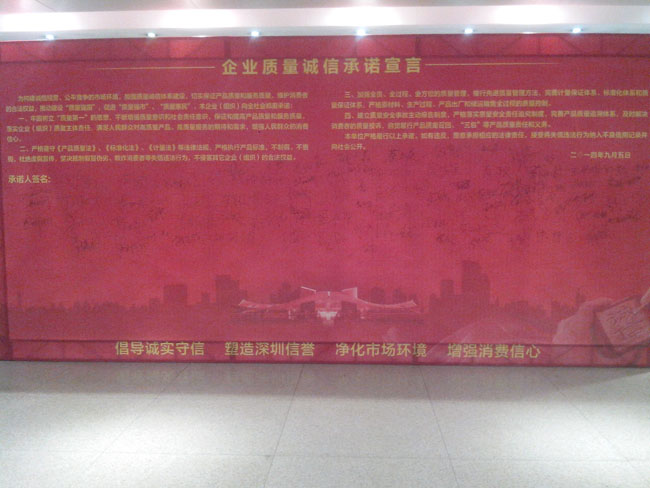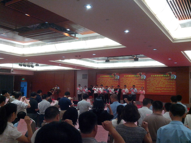 大會的高潮部分是所有與會的企業(yè)代表與政界代表一起舉起右手,宣讀《企業(yè)質量誠信承諾書》:為構建誠信經營、公平競爭的市場環(huán)境,加強質量誠信體系建設,切實保證產品質量,維護消費者的合法權益,推動建設“質量強國”,促進“質量強市”、“質量惠民”。本企業(yè)向社會鄭重承諾:一、牢固樹立“質量第一”的思想,不斷增強質量意識和社會責任意識,保證和提高產品質量,落實企業(yè)質量主體責任,滿足人們群眾對高質量產品的期待和需求,增強人民群眾的消費信心。二、嚴格遵守《產品質量法》、《標準化法》、《計量法》等法律法規(guī),嚴格執(zhí)行產品標準,不制假、不售假,杜絕虛假宣傳,堅決抵制假冒偽劣、欺詐消費者等失信違法行為,不侵害其他企業(yè)合法權益。三、加強全員、全過程、全方位的質量管理,推行先進質量管理方法,完善計量保證體系、標準化體系和質量保證體系,嚴格原材料,生產過程、產品出廠和儲運銷售全過程的照顧質量控制。四、建立質量安全事故主動報告制度,嚴格落實質量安全責任追究制度,完善產品質量追溯體系,及時解決消費者的質量投訴,自覺履行產品質量召回、“三包”等產品質量責任和義務。本單位嚴格履行以上承諾。如有違反,愿意承擔相應的法律責任,接受將失信違法行為納入不良信用記錄并向社會公開。二0一四年九月五日