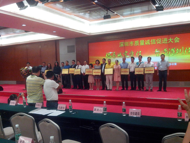 大會最后一項議程是頒發(fā)2013年“廣東省守合同重信用”證書及牌匾,我公司代表也受邀請上臺領取證書及牌匾。