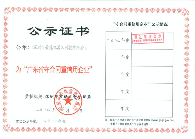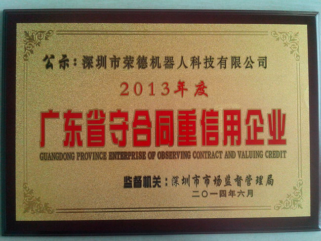 在此之際,非常感謝廣大客戶朋友對公司的認可和滿意,只有客戶對公司的認可,這樣公司合同才能夠嚴格履行,最終才能獲得該榮譽稱號。全體榮德人將會以此為契機,將產品質量和服務做到行業(yè)內一流水平,滿足并不斷超越客戶需求。同時也請客戶放心選購我司的噴涂機器人、自動噴涂設備、自動化生產線,獲得“廣東省名牌產品”的“守重企業(yè)”值得您的信賴,我們將會以最優(yōu)質的質量回報客戶、回報社會,為深圳質量的發(fā)展乃至全國質量的發(fā)展貢獻自己的力量!