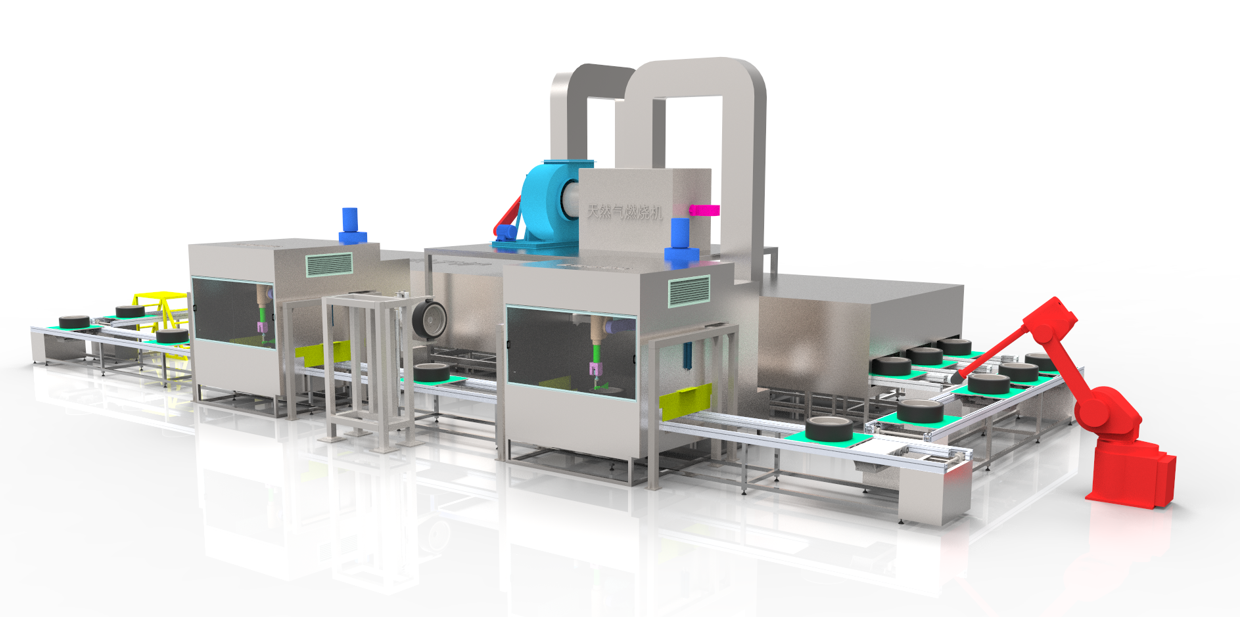橡膠輪胎機(jī)器人自動(dòng)噴涂線是根據(jù)用戶的產(chǎn)品特點(diǎn)及要求設(shè)計(jì),用于輪胎的噴涂、烘干等工序,產(chǎn)品采用工裝式滑撬線輸送,機(jī)器人自動(dòng)噴涂,機(jī)械手自動(dòng)翻面,減少人工勞動(dòng)力,提升企業(yè)自動(dòng)化程度,便于管理。