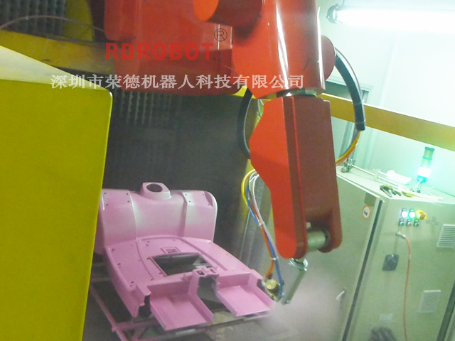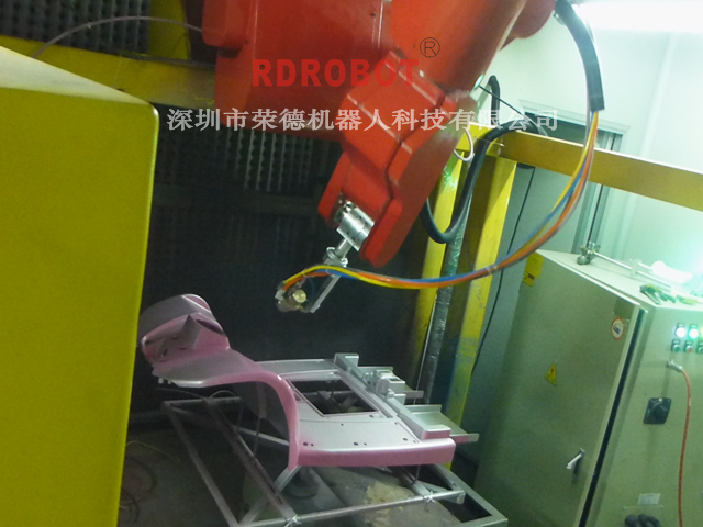 1. 采用目前世界上最前沿的技術(shù)-中空手腕,機器人的手腕上安裝末端工具的法蘭,采用中空結(jié)構(gòu)的形式,使得各種管纜費穿整個手腕;2.自主研發(fā)且通過深圳自主創(chuàng)新產(chǎn)品認(rèn)定并獲得國家科技部創(chuàng)新立項的高性能噴涂機器人;3.各部位轉(zhuǎn)動關(guān)節(jié)主要通過伺服馬達(dá)帶動精密減速器驅(qū)動,任意空間直線和圖標(biāo);4.數(shù)字涂裝:通過數(shù)字化參數(shù)轉(zhuǎn)化成模擬量電信號輸出,氣動比例閥接收該信號,轉(zhuǎn)變成氣壓變化,通過氣壓控制噴涂的形狀、氣流速度、油漆流量;5.體積小、工作范圍大、速度快、精度高,可與轉(zhuǎn)臺、滑臺輸送鏈系統(tǒng)等輔助設(shè)備集成作業(yè)。6.柔性大,可實現(xiàn)外表面和內(nèi)表面的噴涂。7.可按工件軌跡噴涂,可省涂料;8.設(shè)備利用高,基本上所有產(chǎn)品都適用;9.可以與輸送帶配合作動態(tài)同步跟蹤噴涂,提高生產(chǎn)效率;10.各個軸傳動沒有直線運動部件,不會產(chǎn)生粉塵掉落,適合無塵噴涂;機器人技術(shù)參數(shù) 機器人控制柜規(guī)格 機器人工作范圍榮德噴涂機器人技術(shù)特點1.噴涂精確,正常運行時間長、漆料耗用省、工作節(jié)拍短,可24小時不間斷工作,可靠性高2.噴涂速度快,噴涂均勻,依工件變化自動調(diào)整噴槍高低、前后、角度位置,噴涂大小控制靈活,360度全方位無死角噴涂。3.機器人防爆,環(huán)保,安全性能高,操作控制簡單易學(xué)。4.噴涂機器人可以同時噴涂2--5種不同的產(chǎn)品,一臺抵多臺。5.噴涂機器人壽命長,無易損件,保養(yǎng)簡單,比五軸噴漆臺少了導(dǎo)軌、皮帶等易損件;6.程序可存儲300組,可用U盤拷貝程序,管理方便簡單;7.對運動軌跡轉(zhuǎn)角處,可用圓弧過濾功能,在直線末端不用停止,直接圓弧過濾到下一條線,速度沒停,提高了效率,也減少了起停沖擊。8.對運動軌跡可任意加噴槍觸發(fā)器,按產(chǎn)品需要加噴涂位置開關(guān)槍,減少涂料浪費。